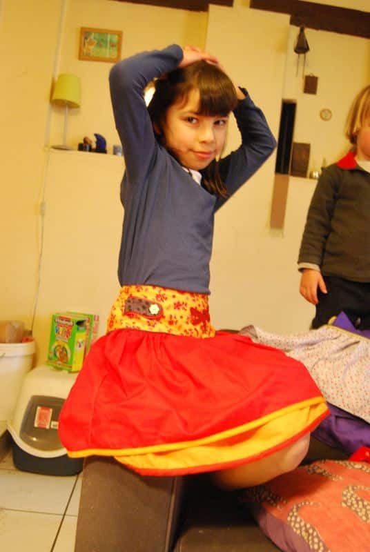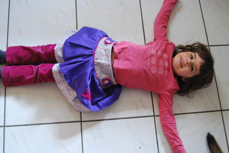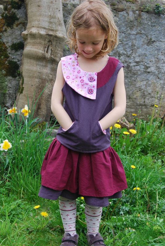 Et me voilà repartie dans la confection d’un petit ensemble ! La jupe comme vous pouvez la reconnaître est de « c’est dimanche » et le haut est inventé ! La jupe a été cousu avec ma belle sœur à qui j’ai montré les bases de la couture.