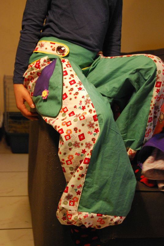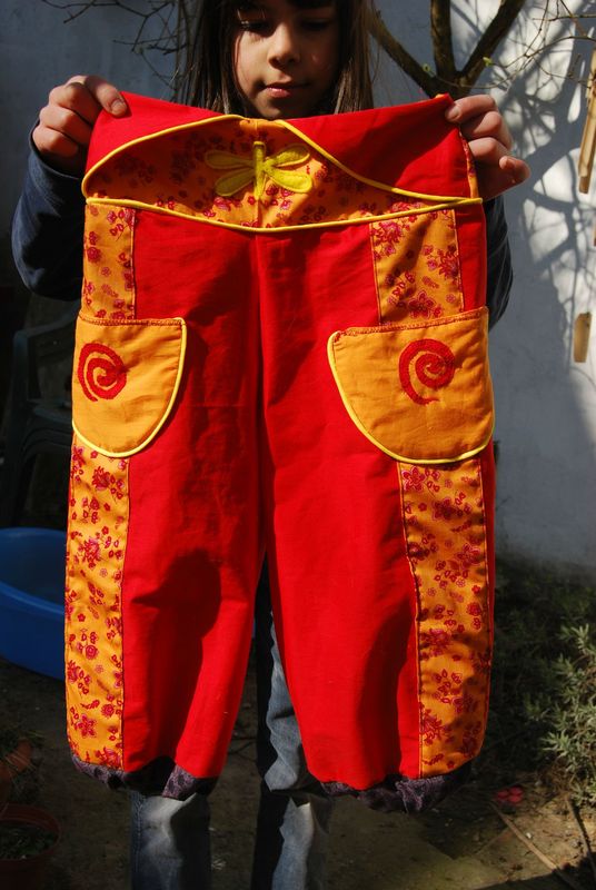 Voici un petit pantalon que j’ai inventé pour ma petite canaille. Mais celle ci ne veut pas le mettre…Donc pas de photo d’elle qui le porte. Peut être plus tard.