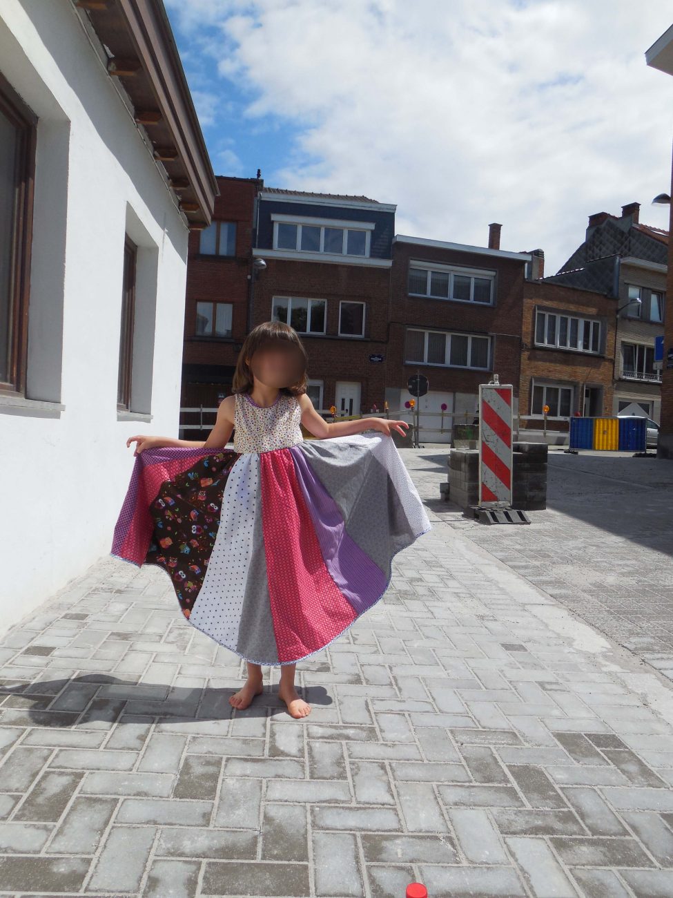 Pour ma grande fille de 8 ans, voici ma dernière réalisation. Une robe légère et colorée. Elle est cousue avec de nombreux tissus et de jolis boutons cœurs.