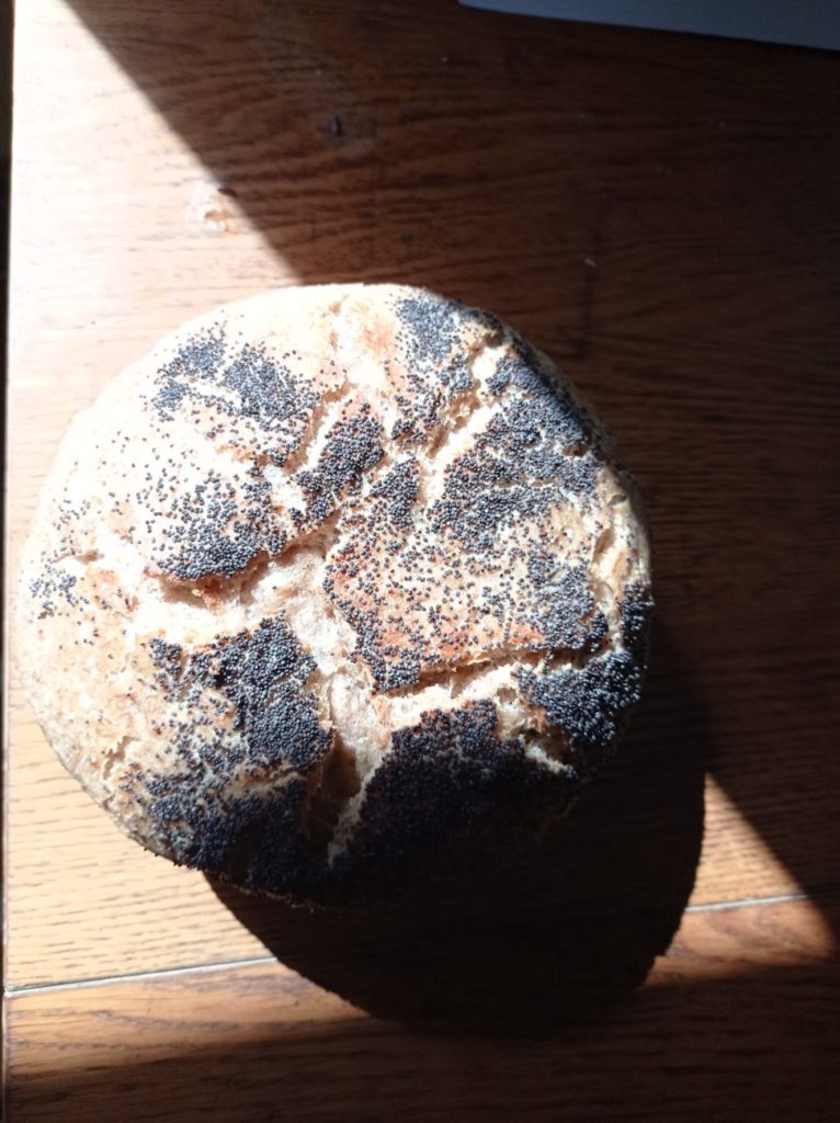 Ingrédient : levain frais nourri 5h auparavant: 600gr – 750 ml d’eau – 500 gr d’épeautre complet 100% – 700 gr de farine d’épeautre à 70 % – 1 grande cuillère de sel et des graines si vous aimez.