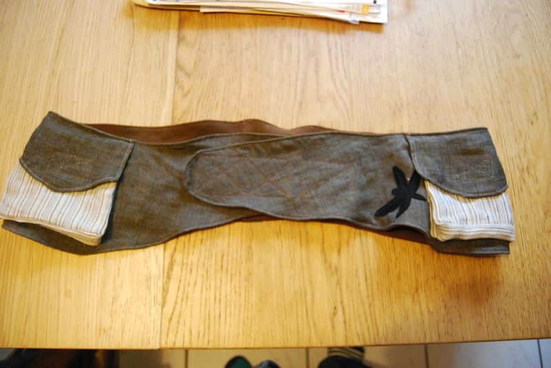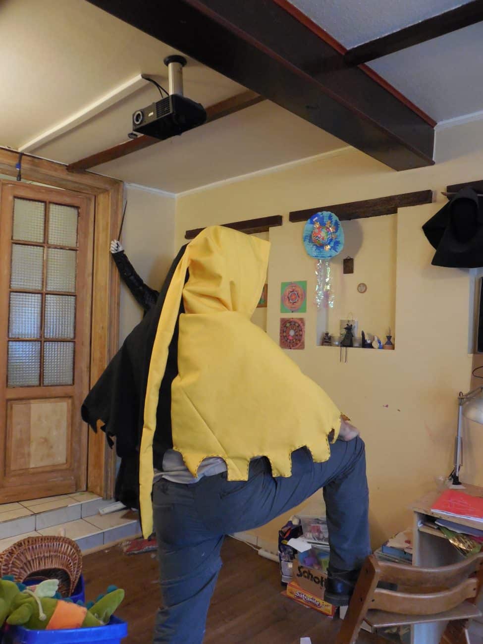 J’ai réalisé ce costume avec deux chemises et deux pantalons. Je les ai coupés en leur centre, pour prendre une partie de chacun et en faire deux costumes. Un sans accessoires et un plus travaillé. Ensuite avec un tissu le plus porche possible j’ai cousu un pantalon pour mettre sur des échasses :